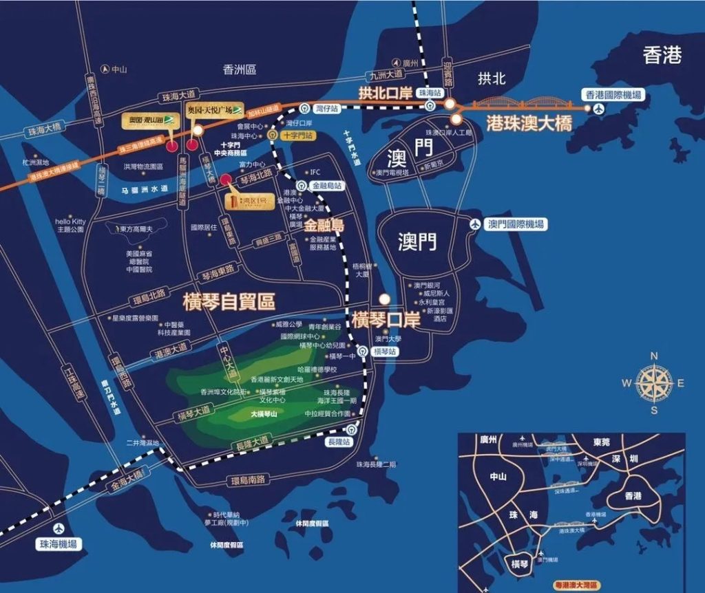项目位于珠海市保税区东大门横琴大桥旁,紧邻港珠澳大桥洪湾桥头出口,南侧紧邻横琴新区,东侧紧邻十字门中央商务区,离澳门仅5公里,离香港35公里,区位优势明显。周边配套珠海国际会展中心、长隆海洋王国等休闲娱乐设施,有横琴幼儿园、横琴小学、澳门大学等学校;美国麻省医院、横琴医院、横琴中医药产业基地、国家首个国际食品安全监测中心也均在附近。